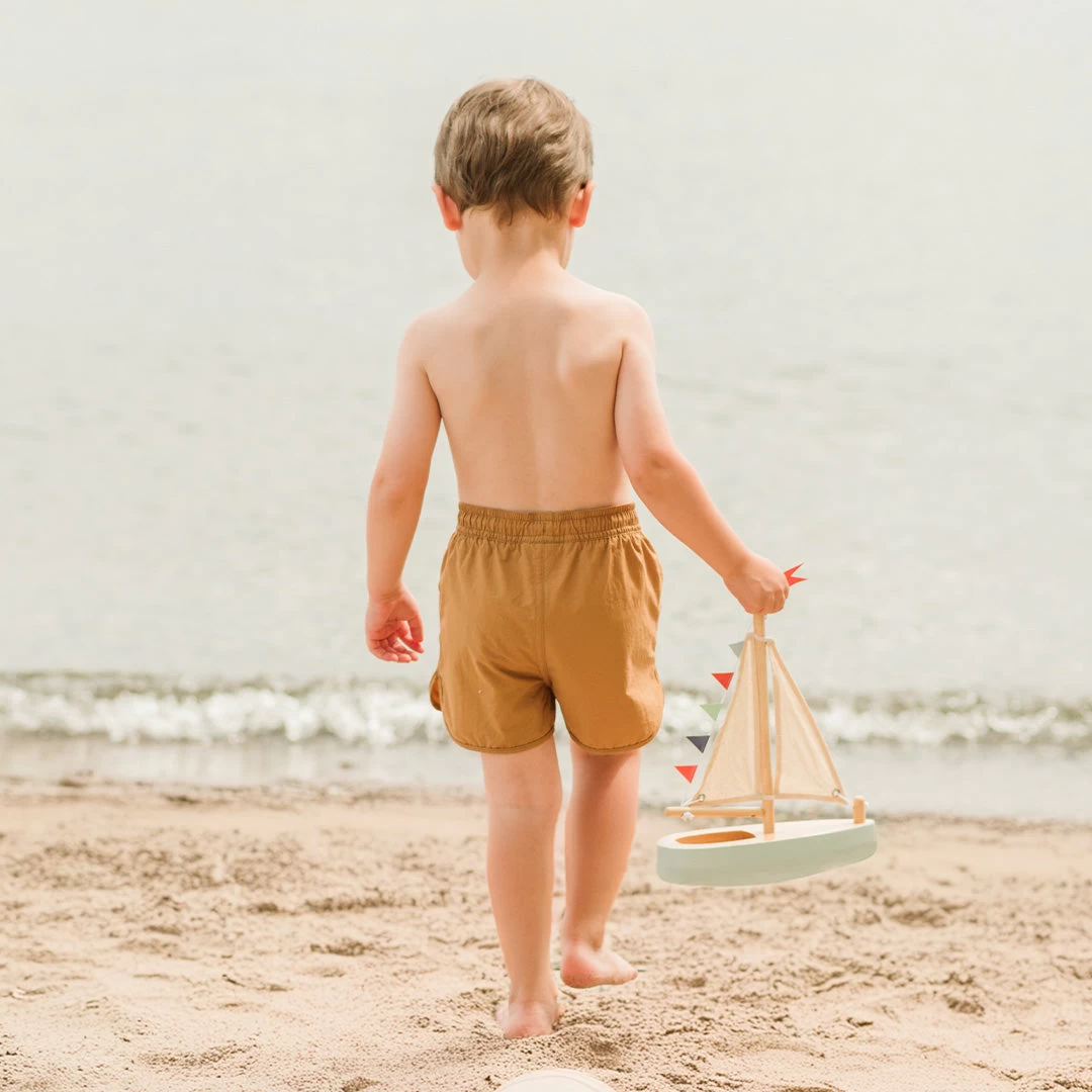 These shorter swim trunks have a sporty style and can be paired with any of our textured rash guards. Made from recycled nylon, the trunks are light and comfortable and have built-in sun protection for poolside picnics and days at the beach. The elasticated waistband makes them easy to put on and take off, allowing them to dip in and out of the water whenever they fancy.