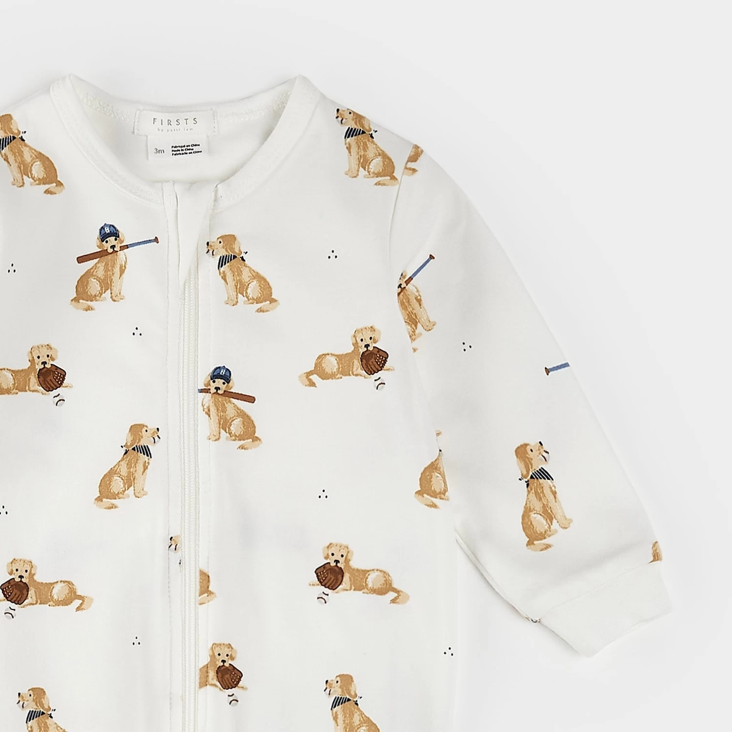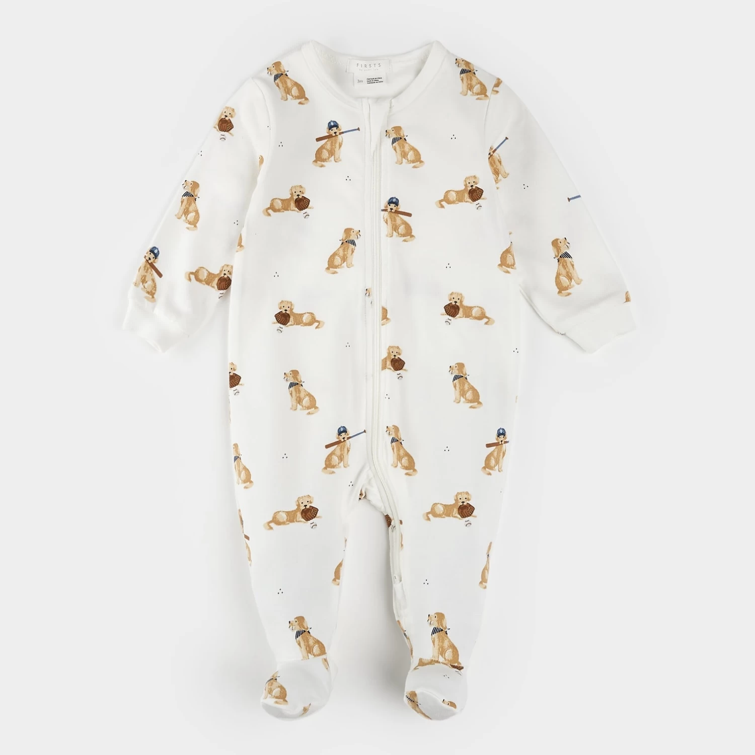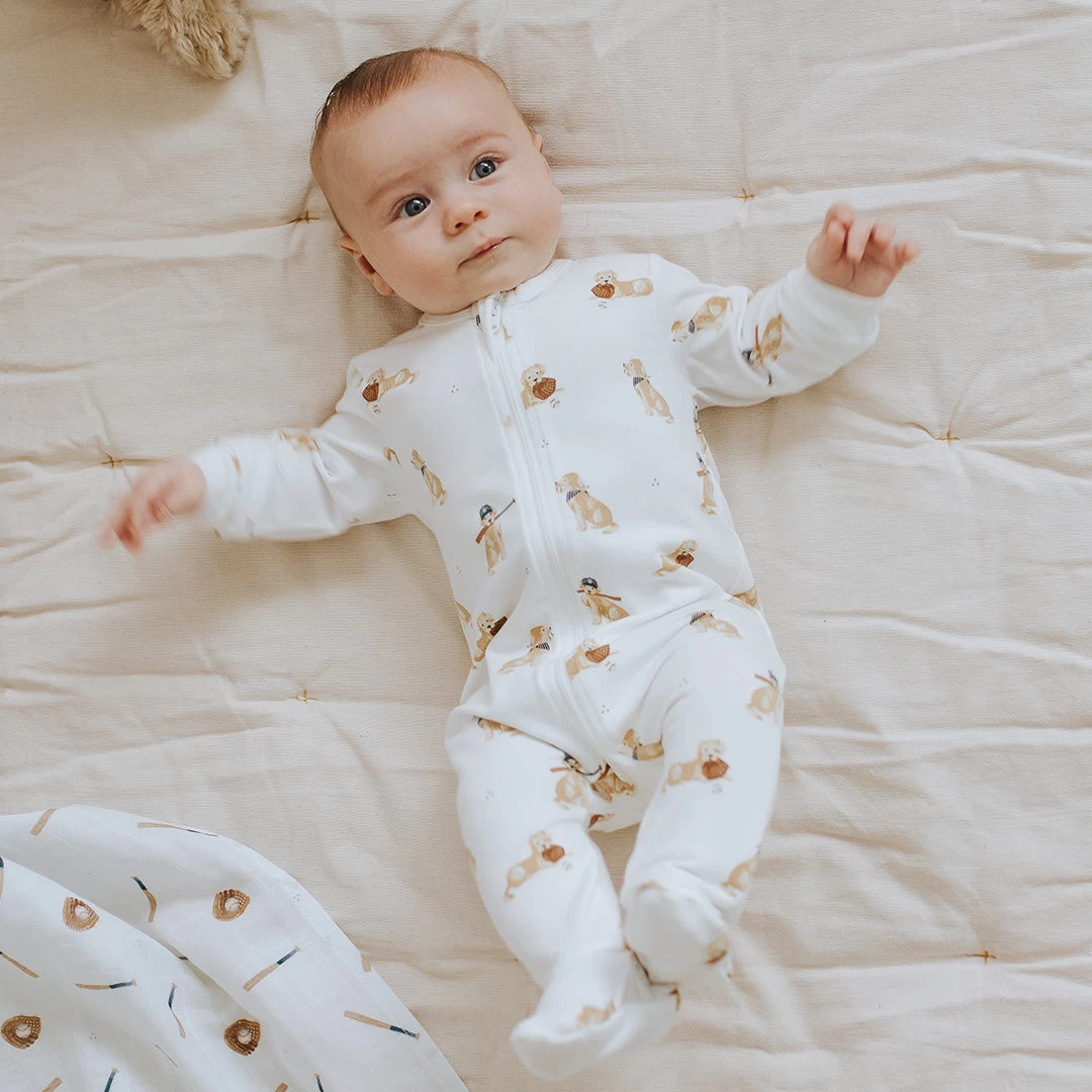 Prevent curveballs in the bedtime routine with this organically grown cotton jersey sleeper with adorable Golden Retriever print. The super soft sleeper has integrated feet and ribbed cuffs to keep their toes toasty and their hands free to play with man’s best friend. Diaper changes and dressing in the morning is made easy with the simple, two-way zip. Coordinating PJs are available for older siblings so the whole team can match while watching the game.
