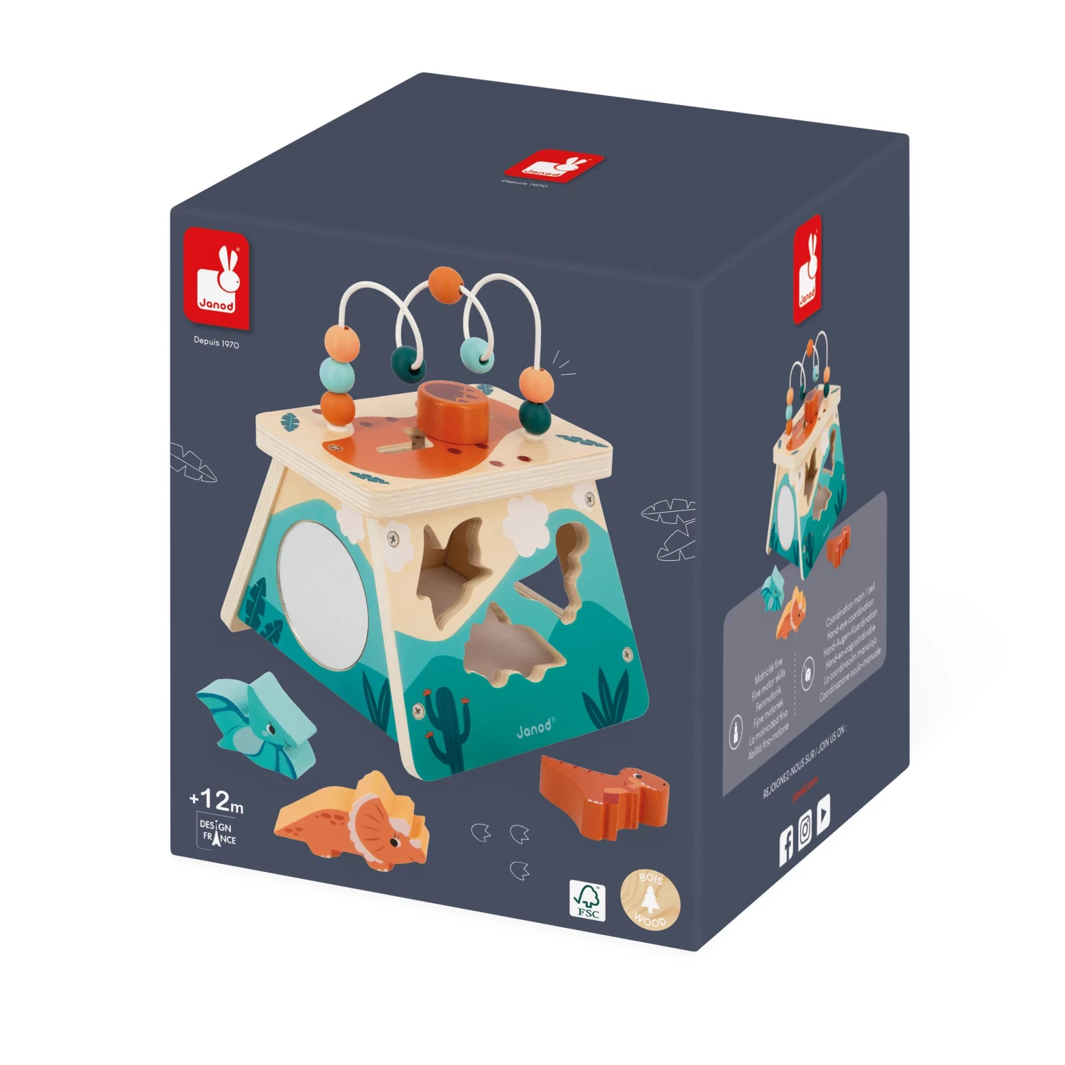 Gently introduce your child to the world of dinosaurs with this multi-activity volcano. On the front panel you will find a shape box with a tyrannosaurus, a triceratops and a Pteranodon to fit into the corresponding shape. The dinosaurs don’t make any noise when they drop thanks to the felt at the bottom of the box. Your child will be able to retrieve the pieces easily thanks to a large opening on the side. The back panel has three gears to turn, the left side has a mirror and finally on the top of this multi-activity volcano there is a maze and an abacus with wooden beads. These 5 activities will help your child develop their fine motor skills, their dexterity and their curiosity. Early learning toy for children from 12 months.