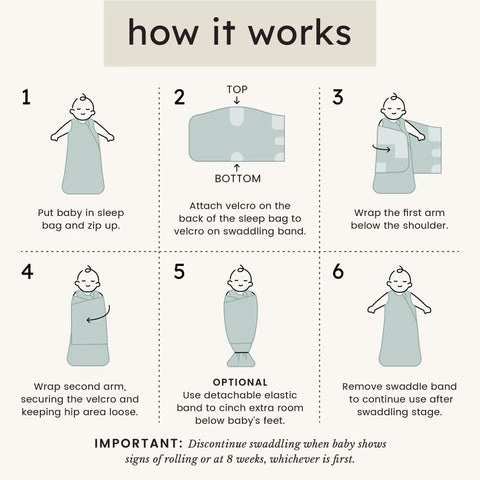 Disclaimer: Following safe swaddling practices, remove the wrap once your baby is 8 weeks old or able to roll over, whichever one comes first. The wrap is intended to only be used with its corresponding sleep bag in size XS.