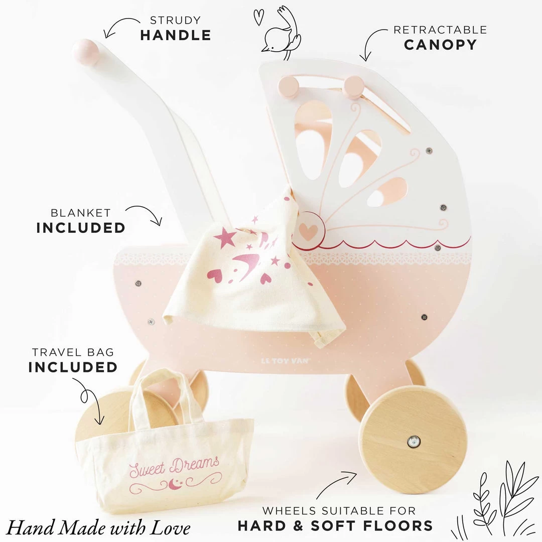 Featuring a soft pastel pink, cream and fresh white color palette, it’s strong structure, soft padded mattress and unique retractable hand-sewn canopy makes it the perfect pram to take soft toys and dolls out in style.