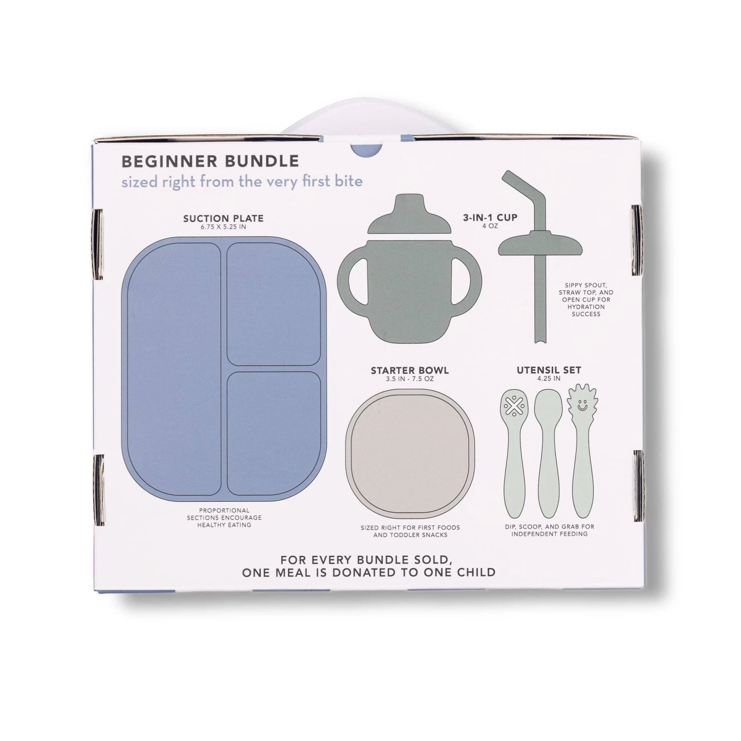 One set includes everything you need: 1 cup, 2 lids, 3 utensils, 1 suction plate, and 1 starter bowl in a ready-to-gift box (10.75″ x 8.75″ x 2.75″).