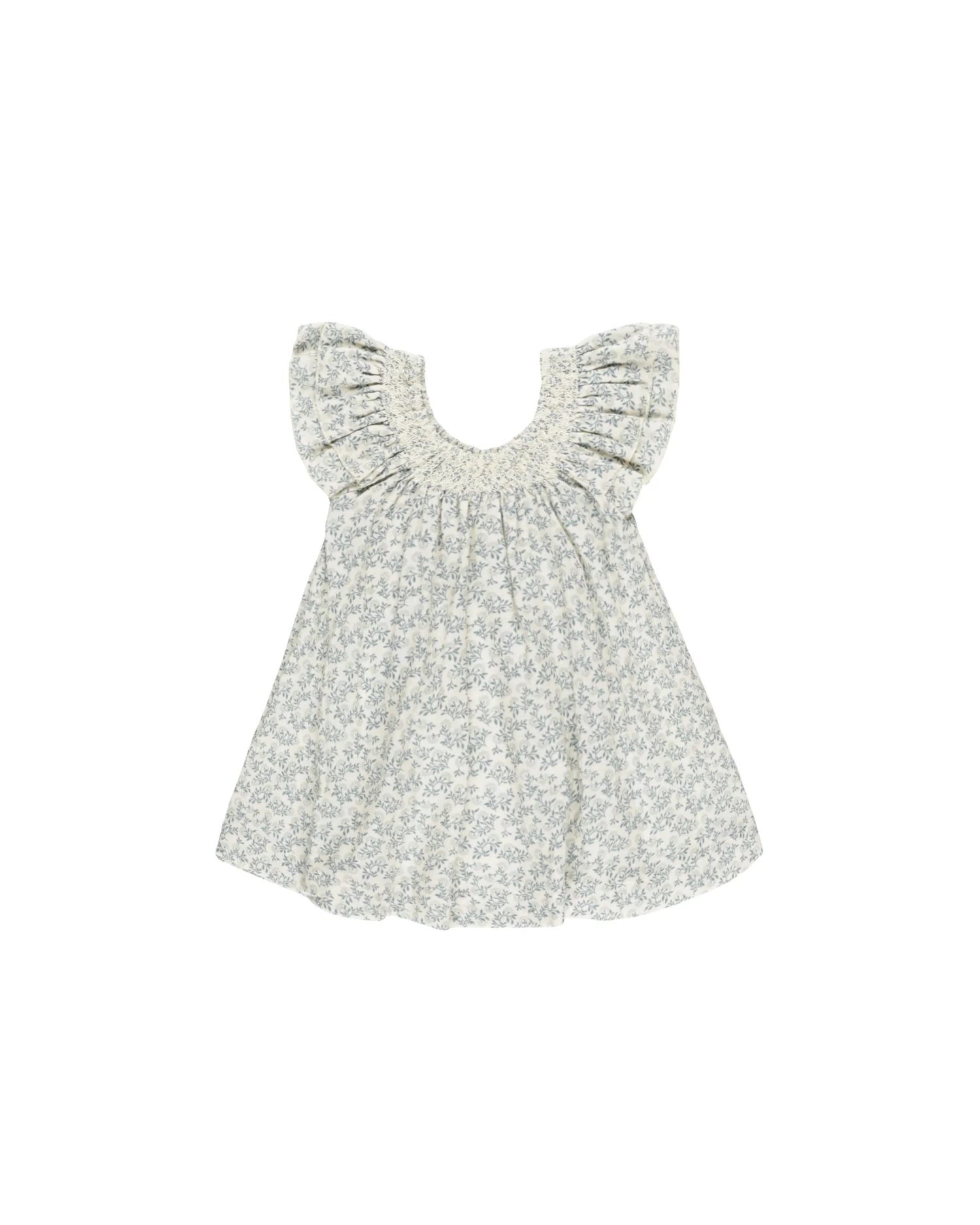 Our Lucia Dress features contrast elastic smocking at the neckline, and sweet flutter sleeves with merrowed trim.