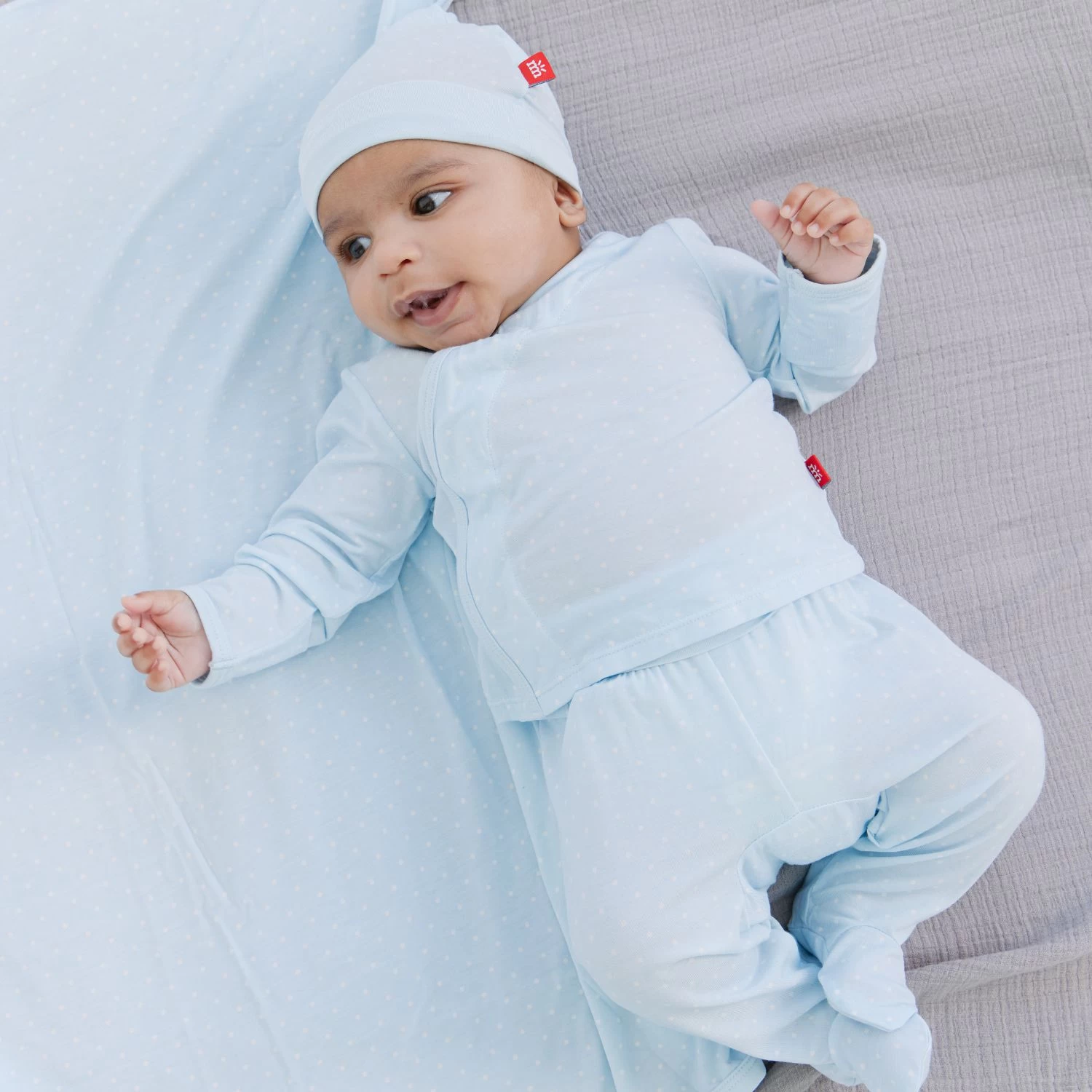 Our time-saving magnetic fasteners and no over-the-head design gets baby dressed quickly while significantly reducing their exposure to the chilly air. Great for new moms and dads during night changings top stays closed during diaper changes and keeps baby warm. Flat elastic waist helps you slip on and off for a quick diaper change. Mitten cuff with fold-over detail to keep baby from scratching itself. This newborn essential is fabulous for brand new babies (in the hospital) and for baby’s first trip home. Comes with matching hat.