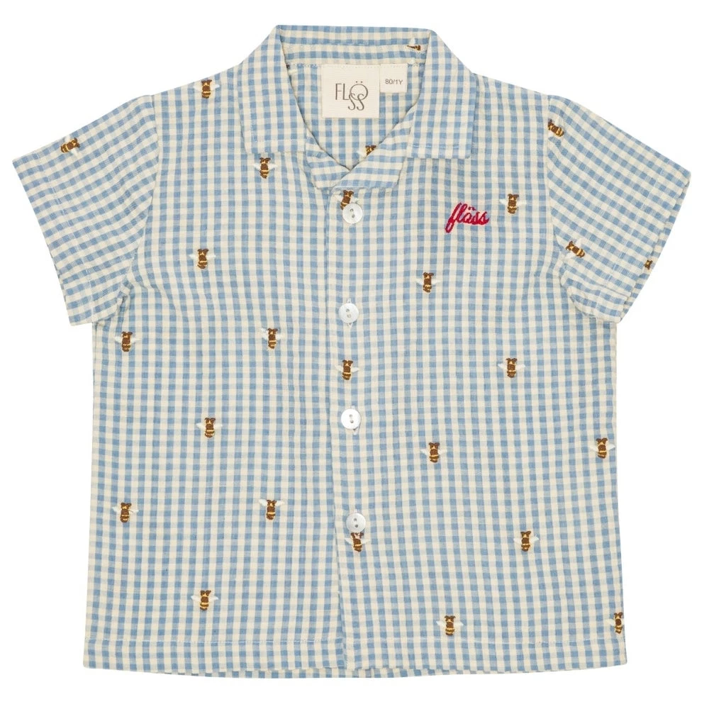 Oliver SS Shirt in blue check with all-over bee embroidery, made of cotton. It has a collar and a summary closure at the front.