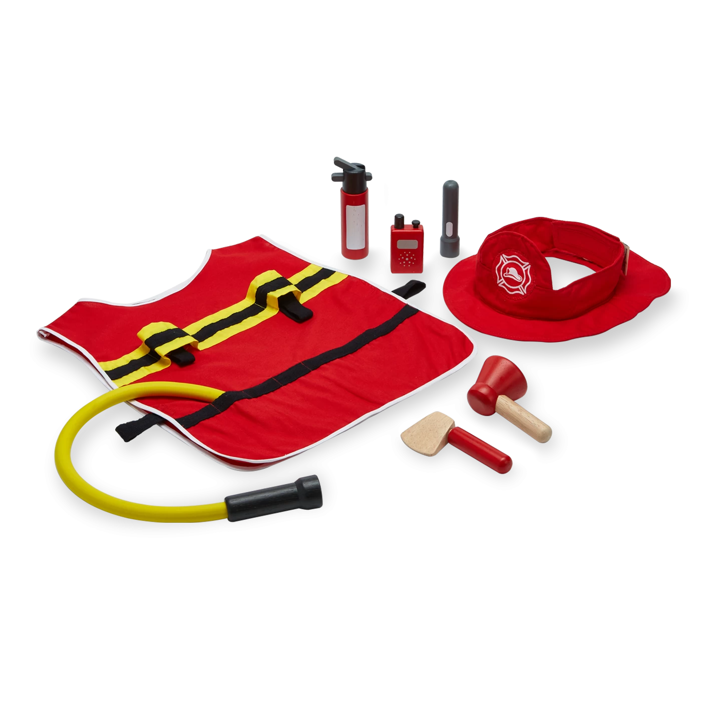 - Set includes an adjustable helmet and jacket, megaphone, fire extinguisher, water hose, flashlight, hatchet and walkie talkie