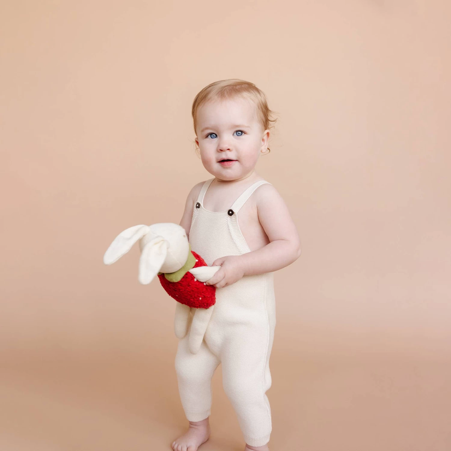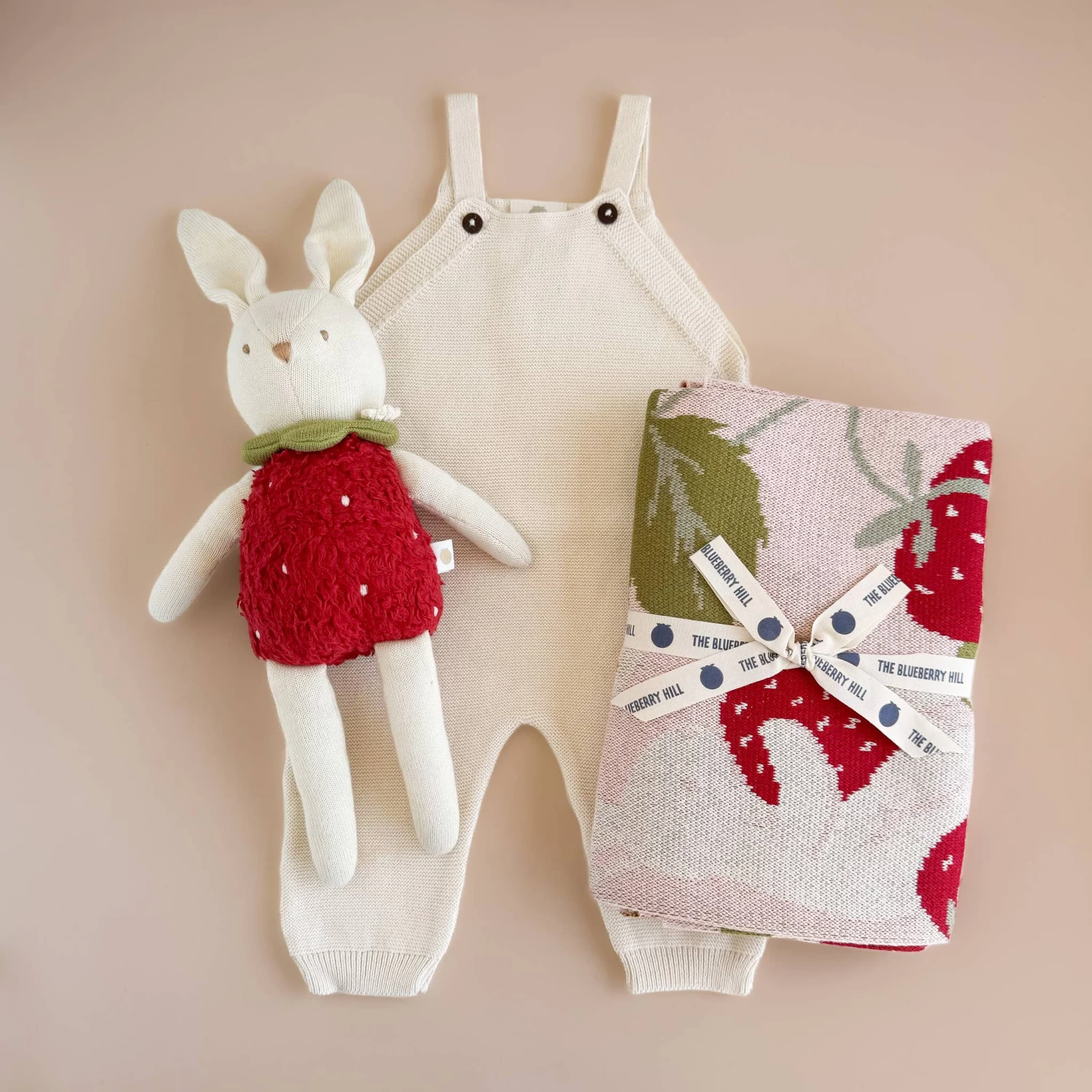 Bailey Bunny often visits the strawberry fields with her friends and enjoys meeting travelers passing by. She likes to hear their stories and help them learn about her community on Blueberry Hill. Gift together with the matching blanket, cardigan, hat or teether.