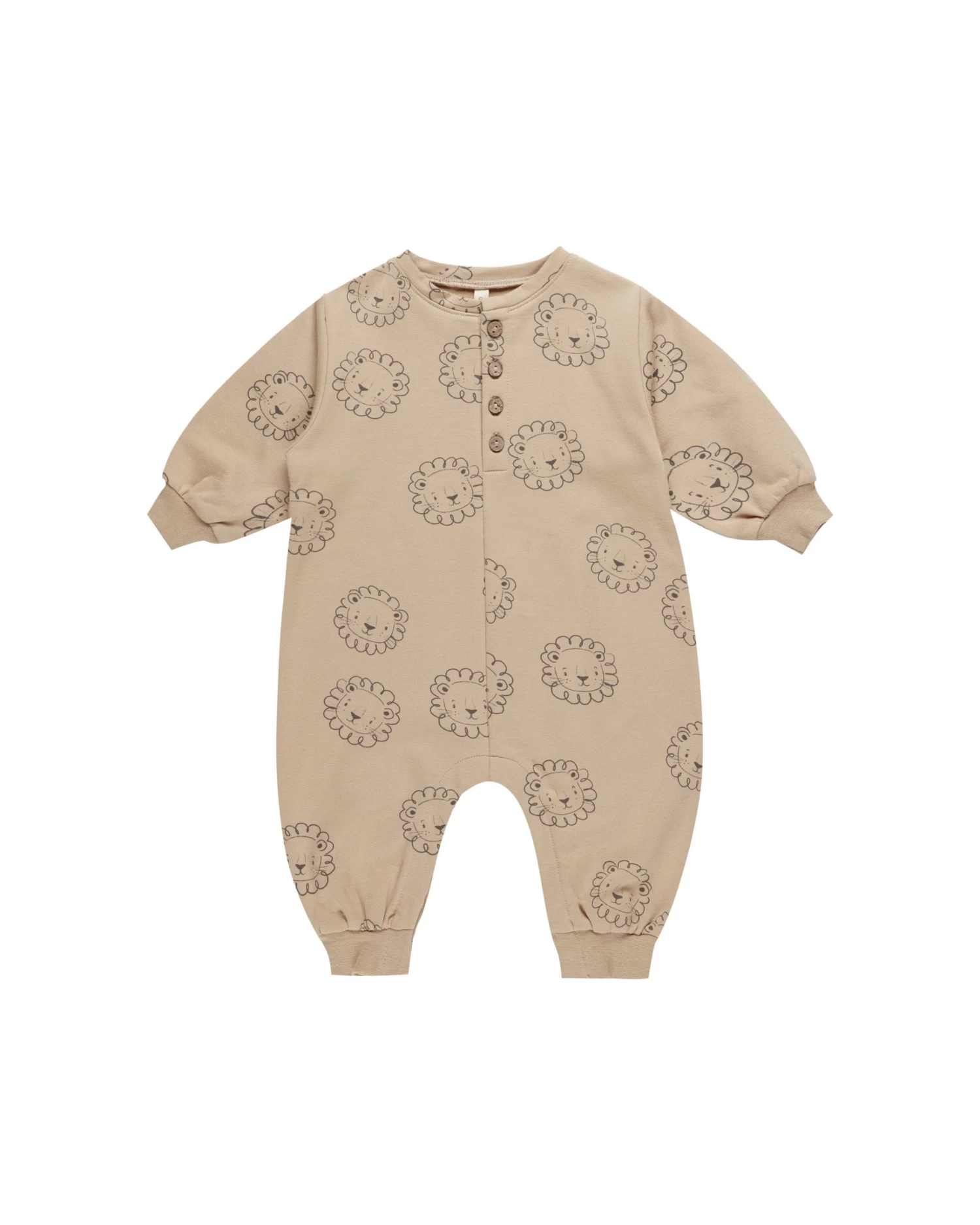 Cozy and soft longsleeve jumpsuit with coconut summarys down the chest, and hidden snaps along the inseam for easy changing on baby sizes.