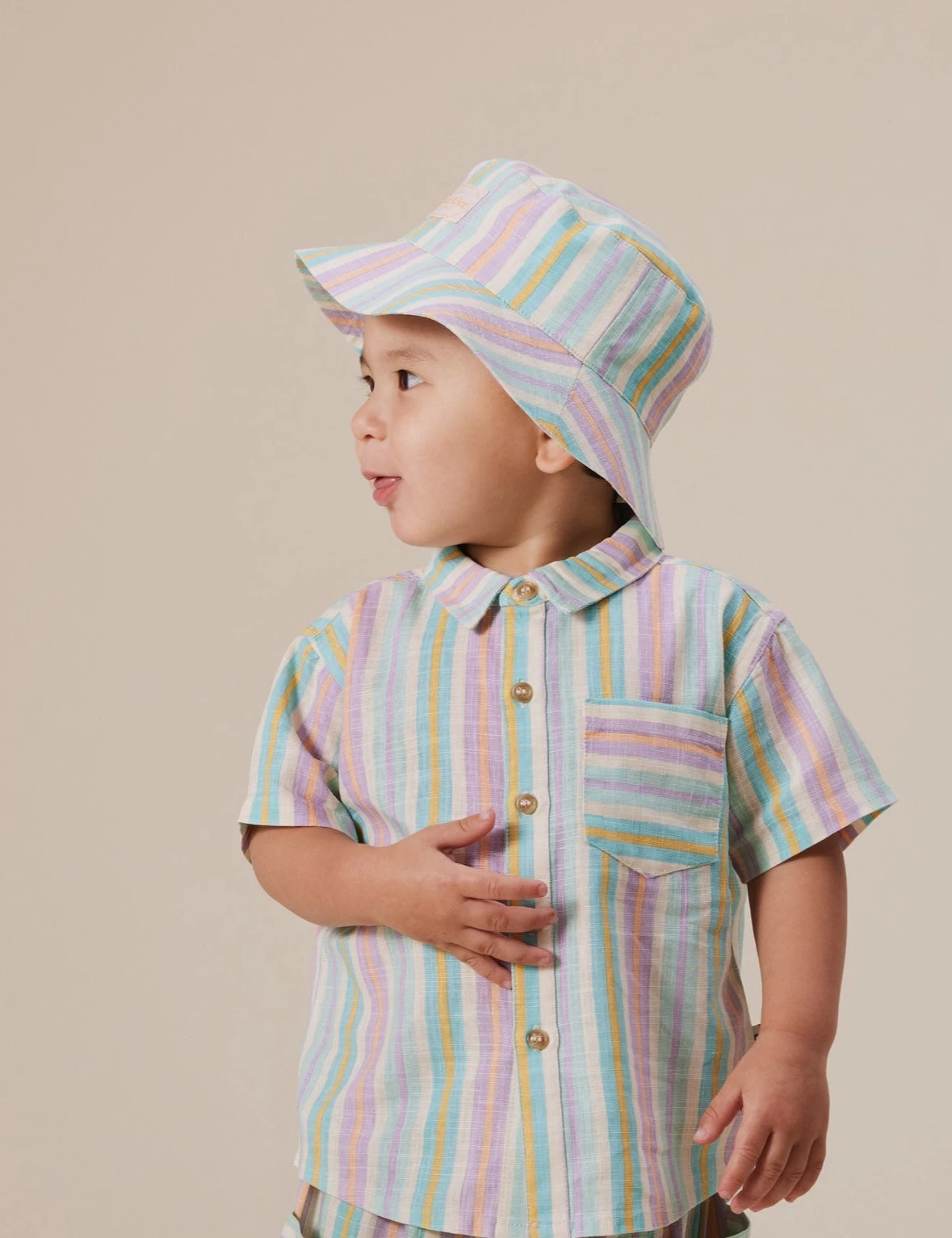 A lightweight, breathable essential Linen Bucket Hat in Resort Stripe, perfect for keeping little ones cool and shaded on sunny days.