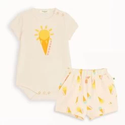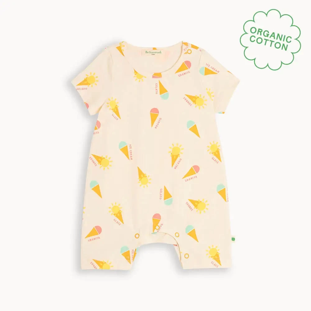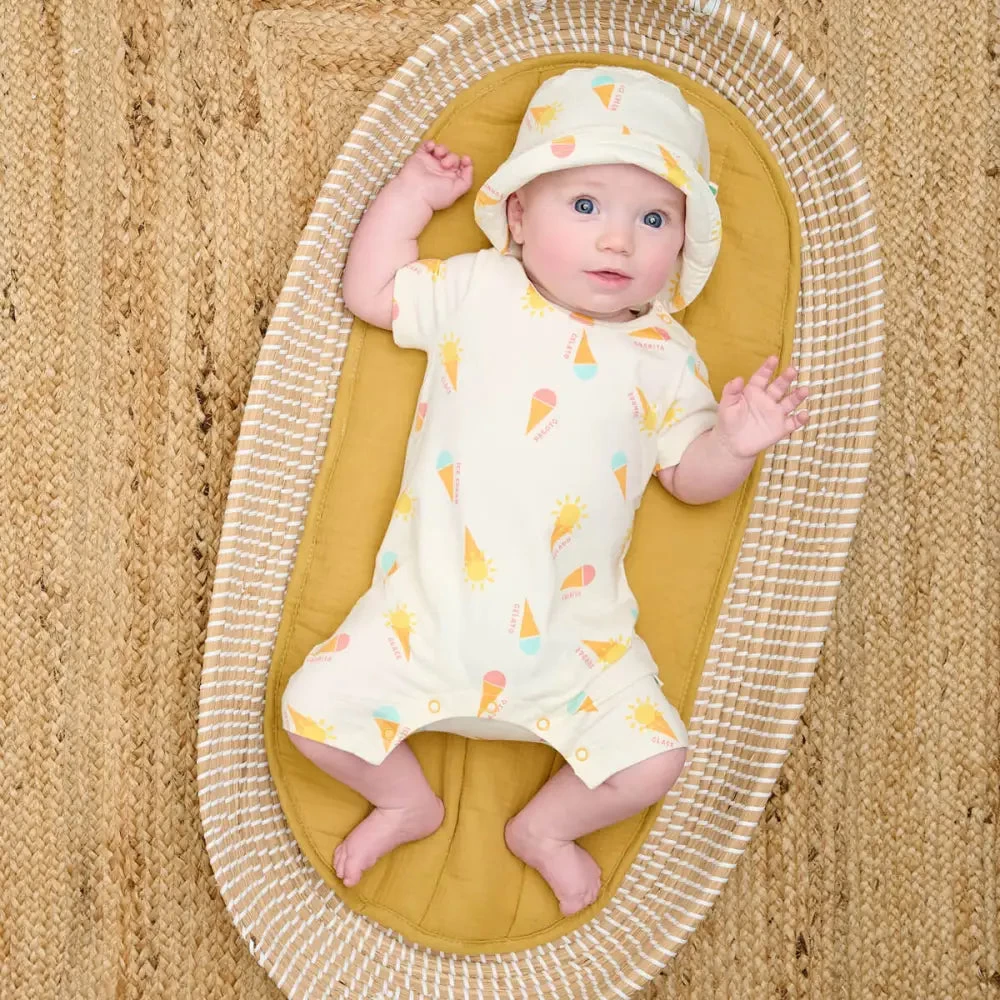 Organic cotton shorty infant romper is the ultimate in function & comfort. The relaxed fit ensures plenty of room for movement, short sleeves & legs for summer cool, making it ideal for active babies & toddlers. Press stud openings at both the shoulder & crotch, making changing easy. All over Gelato Ice cream hand print adds a playful touch, making a great newborn gift. Layer up with a cotton knit cardigan for cooler evenings, or add a matching sun hat for the perfect coordinated summer baby outfit.