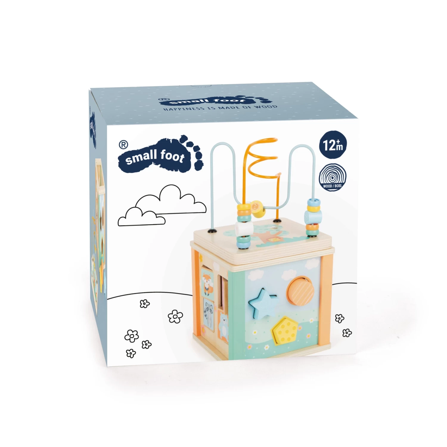 Insert, slide, flip, turn! Playable from five sides, this wooden motoric cube promises even the smallest children varied and fun playing. A bead maze, sorting game, shape-fitting and pushing game, and gears promote colour and shape recognition and fine motor skills. Trendy pastel colours, cute animal motifs and playful details make this motor activity cube an absolute eye-catcher in the nursery. The highlight: the lid is removable and can be stored upside down in the cube, so that the motoric cube can be put away to save space after playing. For 12+ mo.