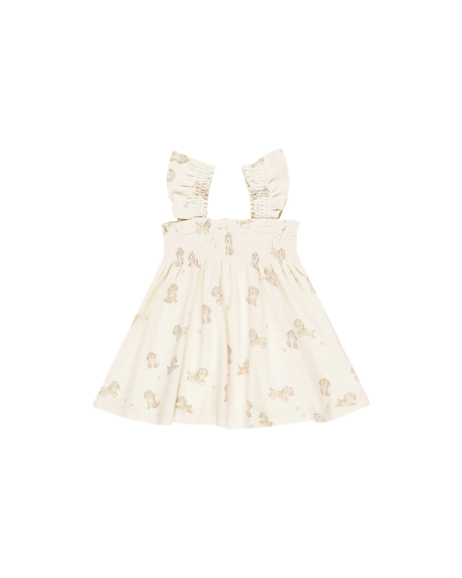 Sweet and easy dress with a smocked bodice, ruffle detail on the straps, and a full skirt. Coordinating bloomers included.