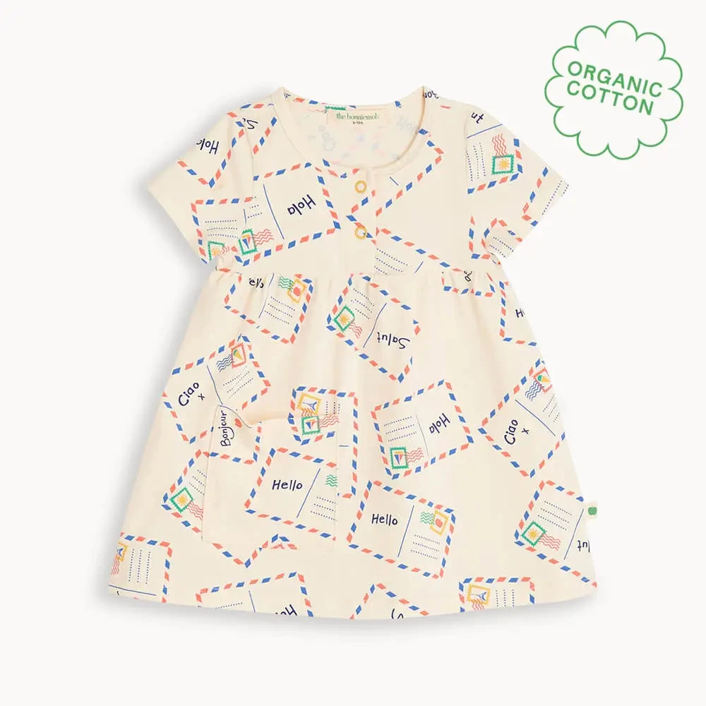 Our organic cotton toddler & childrens jersey dress is a true summer staple. Designed with comfort and durability in mind, this relaxed-fit dress features a round neck, a convenient press-stud front opening for easy dressing, and a cute front pocket for little treasures. The soft, breathable jersey with a hand drawn postcard print makes for the perfect blend of playful style and practicality, ready to take on whatever adventures the summer brings.