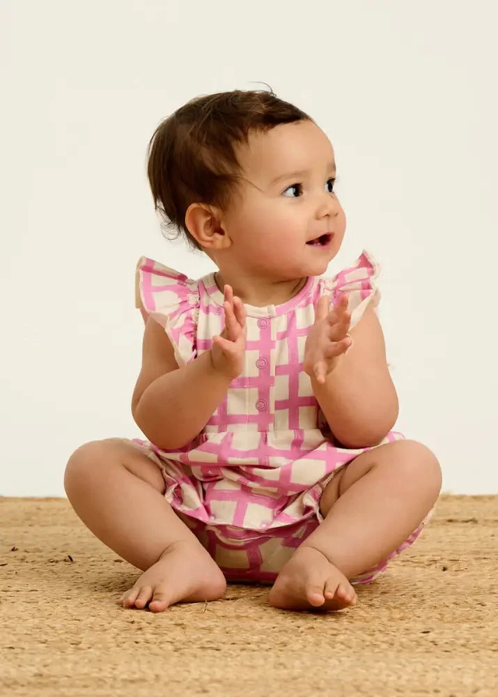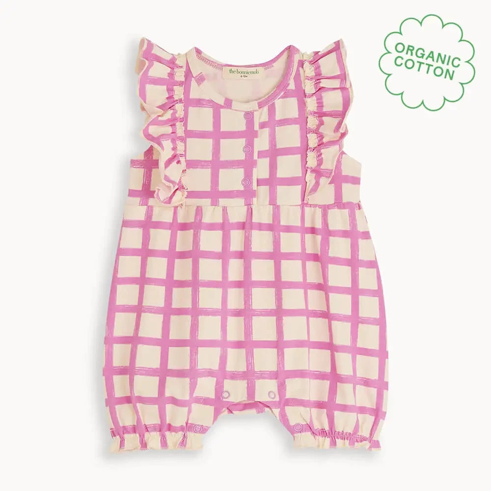 Organic cotton bubble baby romper makes an adorable addition to any baby girls summer wardrobe. With a relaxed fit, pink checker print and cute frill details making it a perfect all in one baby outfit for a summer occasion. With front and crotch poppers, changing is a breeze. Pair with matching Sunrise baby sunhat or layer up with a cotton knit for a complete outfit—a versatile piece and great newborn baby gift.