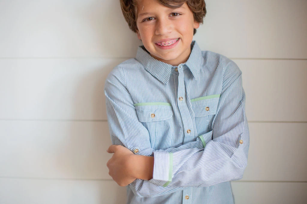 Get ready to be obsessed with this boy’s summary up shirt! Featuring the perfect blue and white striped pattern and a roll tab sleeve. The best part? A pop of sea blue on the roll tab. This will soon become your go-to piece for layering under sweaters or on it’s own. Throw over a pair of Sea Shorts for the perfect chilly beach evening.