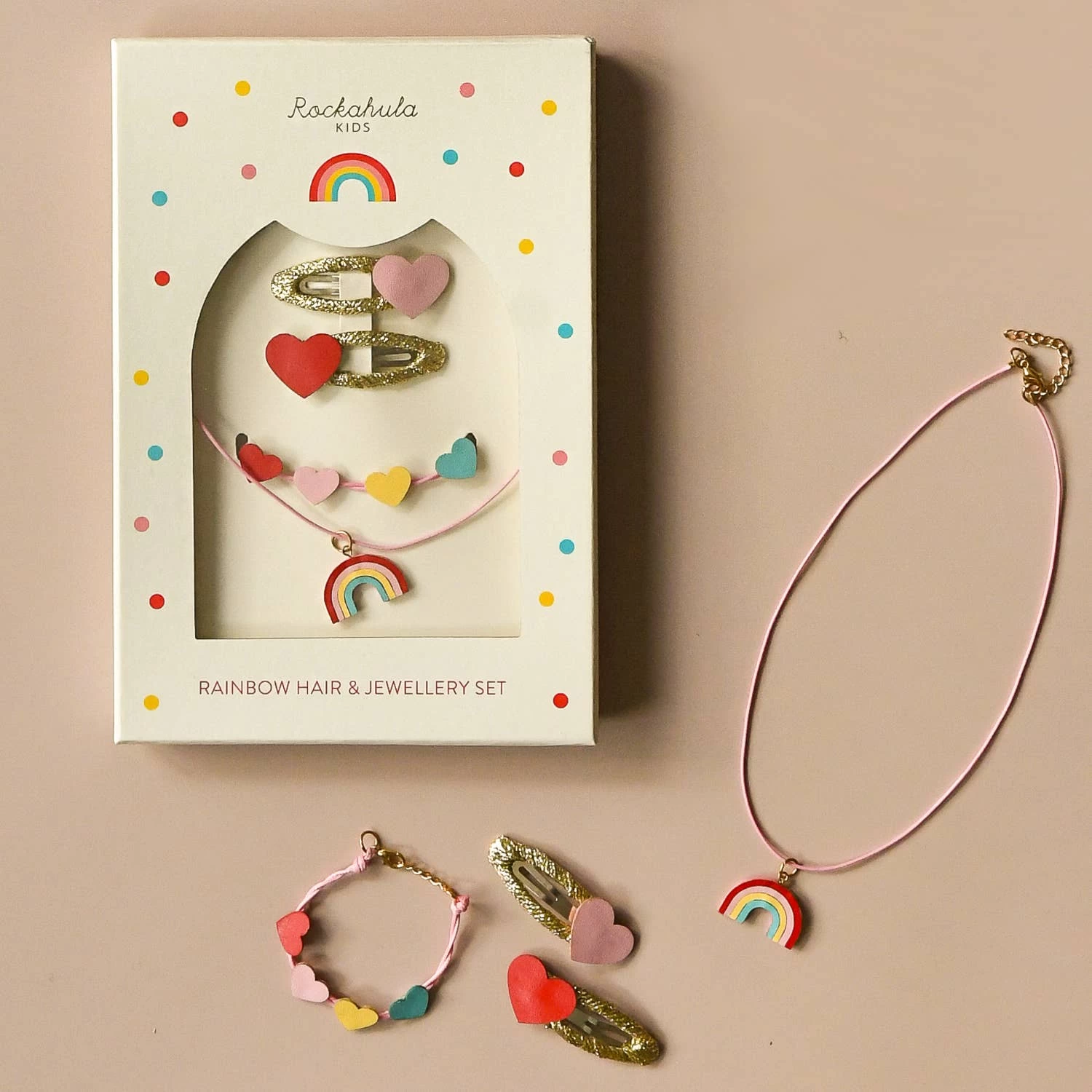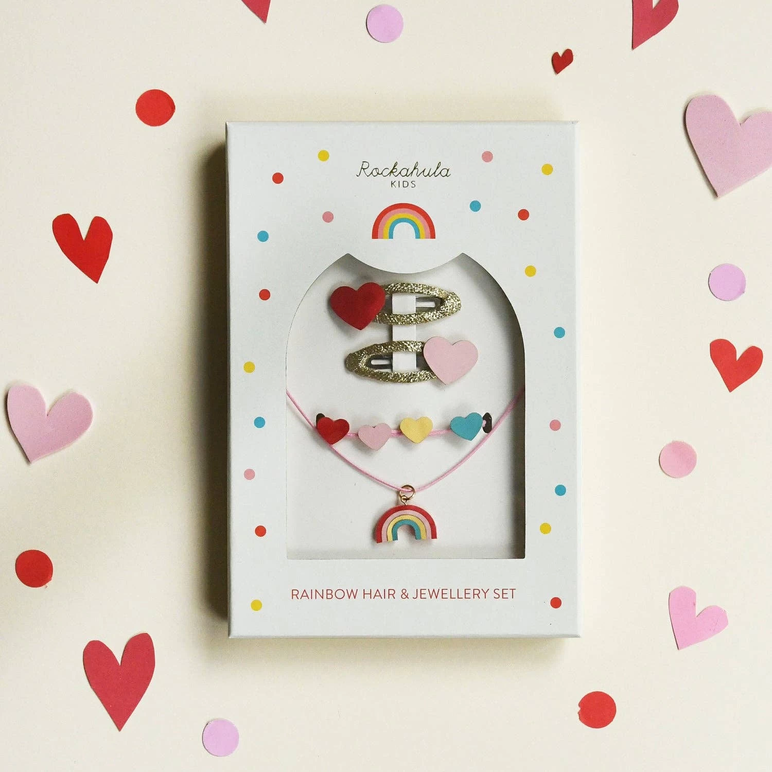 Our vintage rainbow hair and jewellery gift box makes the perfect present! The set includes two sweet love hearts on gold ribbon wrapped clips, a bright rainbow necklace and colourful heart bracelet. Each set is beautifully presented in a gift box that is the perfect size for letter box gifting! What will you find at the end of the rainbow?